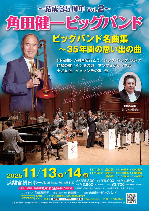 ※半期に一度のツノケンバンド定期公演、今回は場所を浜離宮朝日ホールに移しての2日間計3公演でお届けします。ゲストにバリトン歌手の加賀清孝氏をお迎えします。