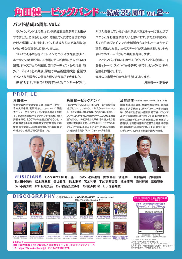 角田健一Con.Arr.Tb、松木理三郎・田中哲也・柴山貴生・鈴木正晃・宮本裕史tp、高井天音・橋本佳明・西村健司・高橋英樹tb、辻野進輔・鈴木直樹・渡辺恭一・川村裕司・丹羽康雄sax、板垣光弘pf、佐久間 和g、古西ただあきb、小山太郎ds、佐藤唯史lp